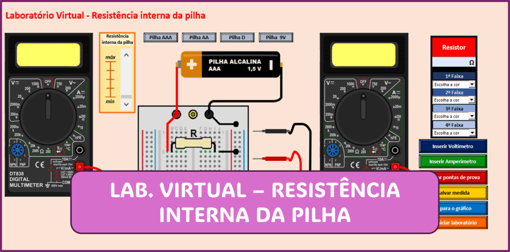Este laboratório foi desenvolvido em um dashboard feito no Excel, onde explora a resistência interna da pilha de forma didática.